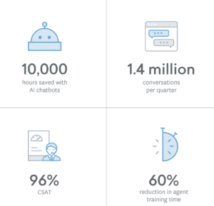 - Ze slaagden erin om chatvolumes 10x te vergroten zonder het aantal medewerkers te hoeven verhogen, dankzij bots en AI.
